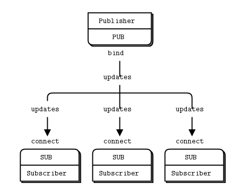PUB 소켓에서 채널에 데이터를 브로드 캐스팅 하면, SUB 소켓에서 필터링을 통해 원하는 데이터를 채널로부터 취득하는 방식으로 동작한다.