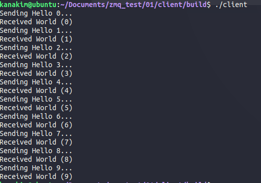 ./server 먼저 실행하고 ./client 실행하면 서로 Hello랑 World 주고받으면서 zmq 테스트 가능.