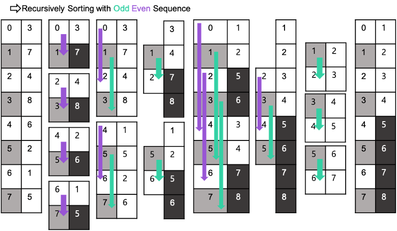 홀짝 합병 정렬 알고리즘을 반으로 계속 나누어 정렬 하다 보면 0으로 시작하여 1로 끝나는(오름 차순), 혹은 1로 시작하여 0 으로 끝나는(내림차순) 0-1 Sequence 형태로 나타나게 된다.