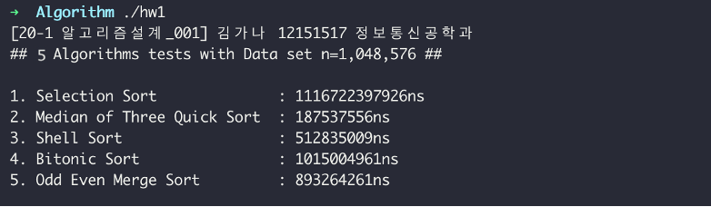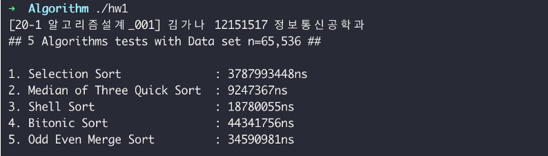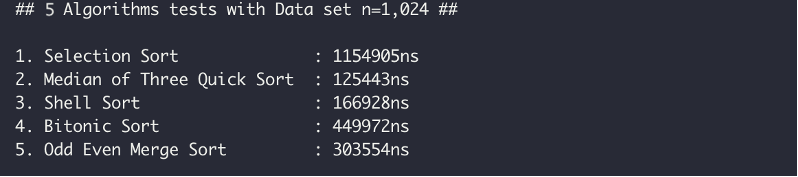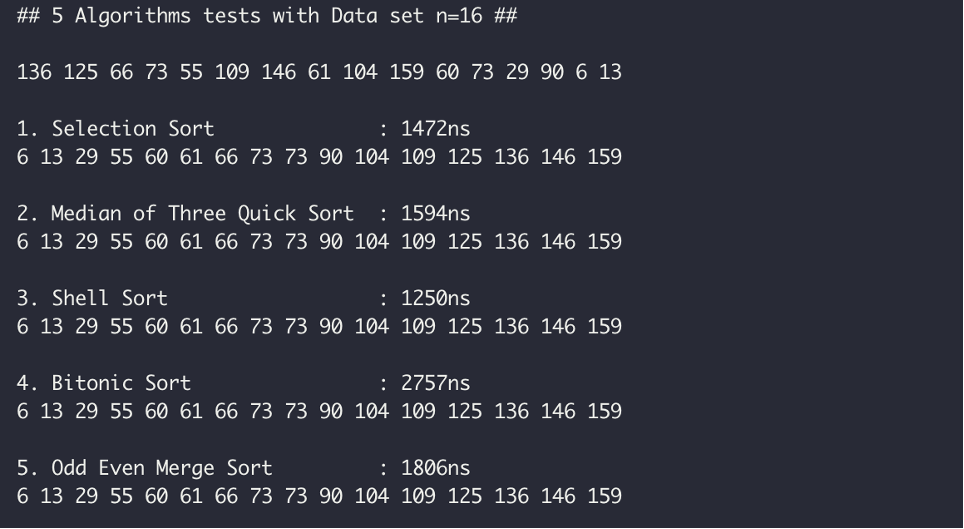 int main(void){ int n = 16; //배열에 저장될 원소 갯수 2의 지수승, 임의로 128, 512, 1024, 4096, 16384, 65536, 262144, 524288, 1048576 int range = n*10;//원소값의 범위. (임의 설정). int *arr1, *arr2, *arr3, *arr4, *arr5;//각 알고리즘 별 실행할 배열 5개. arr1 = new int[n]; arr2 = new int[n]; arr3 = new int[n]; arr4 = new int[n]; arr5 = new int[n]; srand((unsigned int)time(NULL)); for(int i=0; i<n; i++){ arr1[i] = rand() % range;//0~range-1까지 random 난수 생성. } copy(arr1, arr1+n, arr2);copy(arr1, arr1+n, arr3); copy(arr1, arr1+n, arr4); copy(arr1, arr1+n, arr5); ShowArray(arr1, n); //정렬되기 전 데이터 확인. Selection(arr1, n, range); //Selection Sort ShowArray(arr1, n); delete[] arr1; MoTQuick(arr2, n); //Median of Three Quick Sort ShowArray(arr2, n); delete[] arr2; Shell(arr3, n); //Shell Sort ShowArray(arr3, n); delete[] arr3; Bitonic(arr4, n); //Bitonic Sort ShowArray(arr4, n); delete[] arr4; OddEvenMerge(arr5, n); //Odd Even Merge Sort ShowArray(arr5, n); delete[] arr5; return 0; } void ShowArray(int* arr, int n){ for(int i=0; i<n; i++){ cout<<arr[i]<<' '; } cout<<endl<<endl; }Result