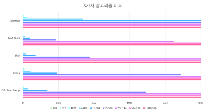 실행시간(n = 100만) 시간 복잡도 Stable In-Place MoT Quick 0.19초 O(nlogn) No Yes Shell 0.51초 O(logn) Yes Yes Odd Even Merge 0.89초 O(log^2(n)) No Yes Bitonic 1.02초 O(log^2(n)) No Yes Selection 1116.72초