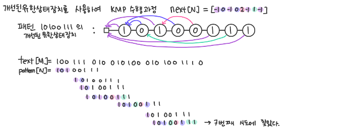 위의 initNext()함수로 구한 유한 상태 장치를 보면, 자기 앞 패턴이 어디 까지 일치하는지 를 알려주는 장치이다. 배열의 5번째 값을 보면 2이다. 이는 자신 앞의 패턴들이 전체 패턴의 2번째 까지 일치하므로 2번째까지의 검사는 동일하므로 그 다음부터 매칭검사를 하게끔 3번째부터 검사하라는 인덱스 2의 값을 저장한 것이다. 마찬가지로 배열의 4번째 값을 보면 1이다. 이는 자신 앞의 패턴들이 전체 패턴의 1번째 까지 일치하므로 2번째부터 검사하라는 인덱스의 1값을 저장한 것이다. 하지만 이 유한 상태 장치의 문제를 보면, 불일치가 발생했을 경우 다시 위치를 이동하여 재검사를 했는데 또다시 불일치가 일어나는 경우이다. 즉 불일치 전이의 이동 전후에 있는 문자가 동일한 경우 비교를 여러 번 하게 된다. 이는 불필요한 작업이며, 처음부터 패턴의 시작점으로 이동하게 하는 것이 효율적이다.